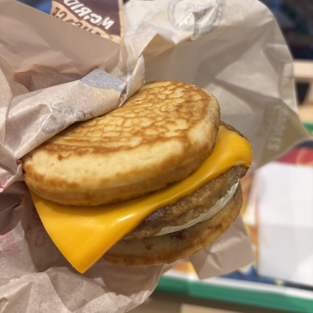 マックグリドルの最大の特徴は、バンズがパンケーキであるということ。メープル風味の甘いグリドルケーキで、ソーセージや卵、チーズといった“塩気のある具材”をサンドした、マクドナルド朝メニューの中でも異色の存在です。